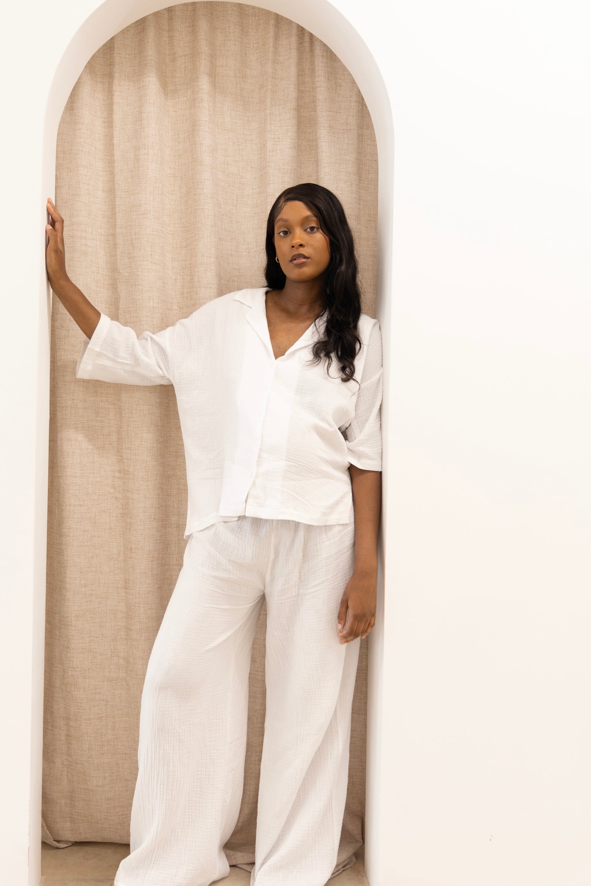 Meet the Santorini Set - easy, elevated, and made to move with you. Crafted from breathable double gauze cotton, it’s soft on skin and relaxed by nature. With an oversized shirt and wide-leg trousers, it’s the perfect blend of comfort and ease for home, holidays, and everything in between.